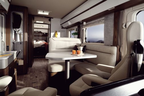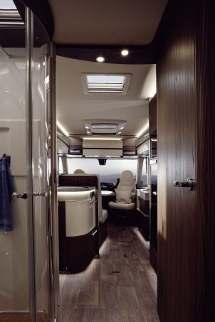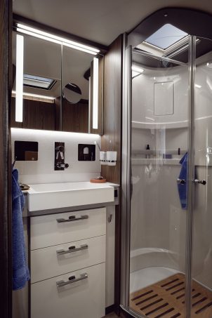 Ce modèle dispose naturellement d’un cabinet de toilette XXL, avec douche indépendante et lavabo ergonomique. Il embarque en prime un efficace chauffage central ainsi que des éclairages à intensité variable.