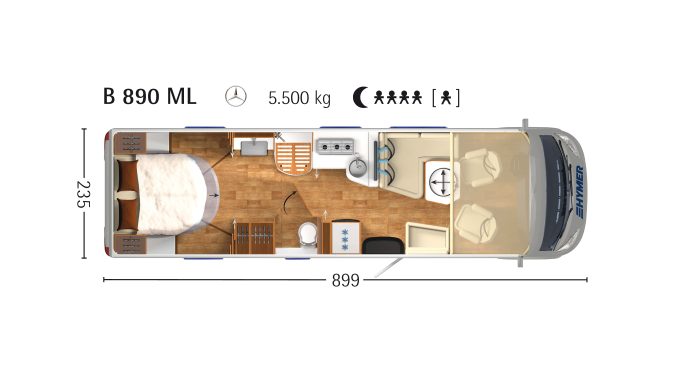 Avec un PTAC de 5,5 tonnes, le nouvel intégral I 890 à lit central se classe directement dans la catégorie poids lourd. Il se démarque par un châssis à double plancher de conception innovante (SLC) issu d’un partenariat entre AL-KO et Hymer. Celui-ci est entraîné par une tête motrice de Mercedes Sprinter traction pouvant recevoir un moteur puissant (jusqu'à 177 ch) accolé à une boîte mécanique 6 rapports (de série) ou automatique à 9 rapports (en option).