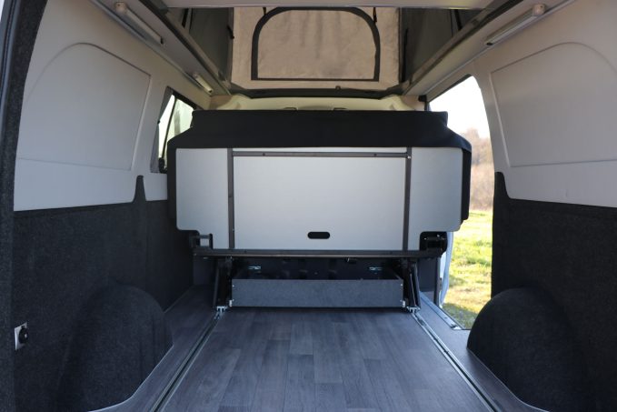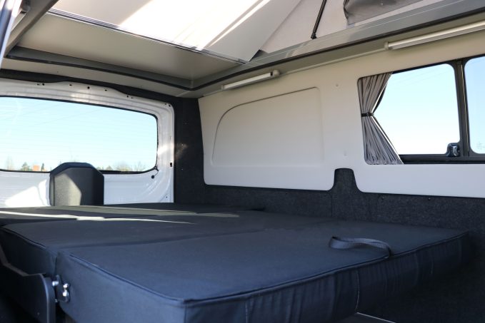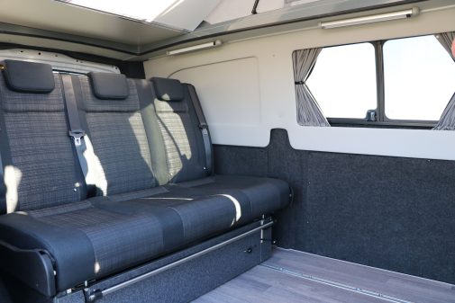 Le travail consiste, dans un premier temps, à isoler l’habitacle avec de l’X-Trem Isolator puis à habiller les parois avec des matériaux de qualité et résistant à l’usure. Des rideaux sont ensuite posés au niveau des vitres arrière. Le plancher reçoit pour sa part une banquette trois places Reimo Variotech équipée de ceintures à enrouleur 3 points. Celle-ci repose sur des rails coulissants afin de pouvoir optimiser l’espace à sa guise tout en conservant un bon volume au coffre. Cette solide banquette (80 kg sur la balance) peut se transformer, si nécessaire, en lit pour deux personnes (200 x 164 cm).