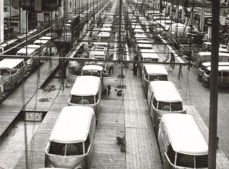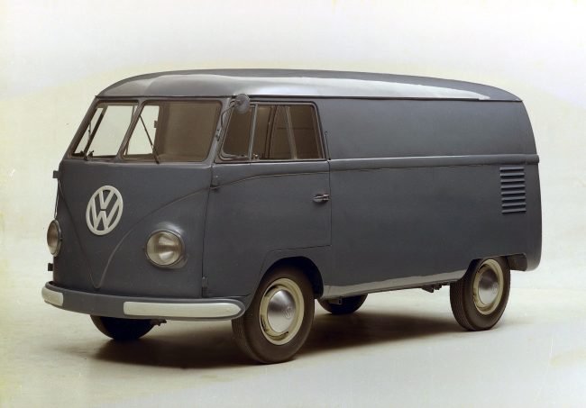 C’est le 8 mars 1950 que sort des chaînes de Volkswagen le premier Transporter. Un utilitaire développé à partir de la Coccinelle, dont il reprend l’architecture ''tout-à-l’arrière'' et le moteur 1,1 litre avec 4 cylindres à plat (type boxer) refroidi par air de 25 ch. La genèse de l’engin serait attribuable à l’importateur hollandais qui, en découvrant un châssis nu de Coccinelle, modifié pour le transport au sein de l’usine en 1947, y devine un nouveau débouché. Quelques prototypes plus tard le ''Type 2'' (la Coccinelle devenant alors le Type 1). Les variantes se multiplient, du minibus au pick-up en passant par le plateau pour atteindre 30 versions au total. De son côté, Westfalia élabore un véhicule de loisirs avec aménagement démontable et toit textile ; nous sommes alors en 1951. Cinq ans plus tard, la production, limitée dans l’usine de Wolfsburg, est transférée dans la nouvelle usine de Hanovre, d’où les versions actuelles sortent encore aujourd’hui.