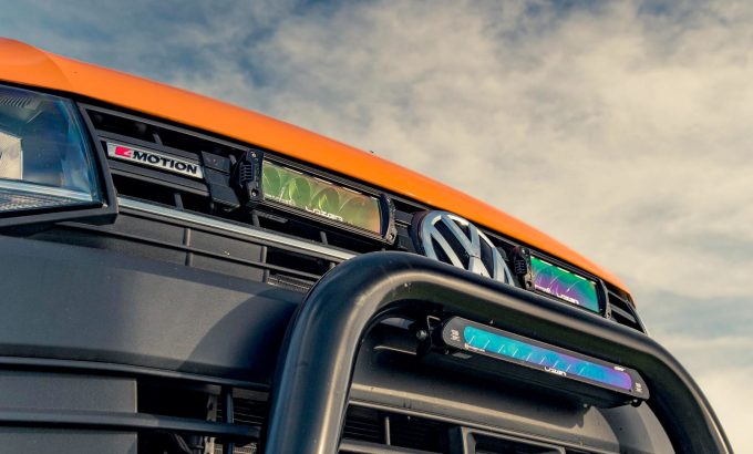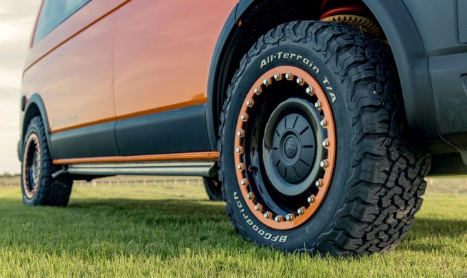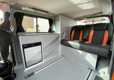Les trains roulants subissent les premières modifications. Les suspensions sont ainsi rehaussées, les jantes changées pour des modèles en acier renforcé (17 pouces) et dotées de pneumatiques spéciaux (BF Goodrich All-Terrain T/A). La face avant reçoit trois éclairages longue portée Lazer, intégrés dans la calandre, ainsi qu’un pare-buffle accompagné de bas de caisse tubulaires pour leur protection. La roue de secours et un jerrican à carburant prennent place sur un support en alu fixé sur le hayon arrière. Le toit, de son côté, est découpé pour accueillir une structure relevable à toile souple d’origine SCA, dissimulant un grand couchage. Après l’isolation de l’intérieur, Rolling Homes recouvre le plancher du fourgon Volkswagen avec un revêtement anti-salissures. Viens ensuite le montage du mobilier au style contemporain (gris). Réalisé sur mesure en bois, il bénéficie de surfaces de travail en Corian et compte pas mal d’espaces de stockage. En plus d’un réchaud à deux feux et d’un évier (alimenté par deux réservoirs et une pompe à eau), le bloc-cuisine comprend un réfrigérateur de 50 litres. Les repas peuvent être pris à l’intérieur ou à l’extérieur, sur une table amovible à quatre pieds. La banquette passager RIB est montée sur rails. Elle se convertit en lit biplace en un tournemain. Une batterie auxiliaire de 120 A alimente la partie habitable dont les éclairages à LED.