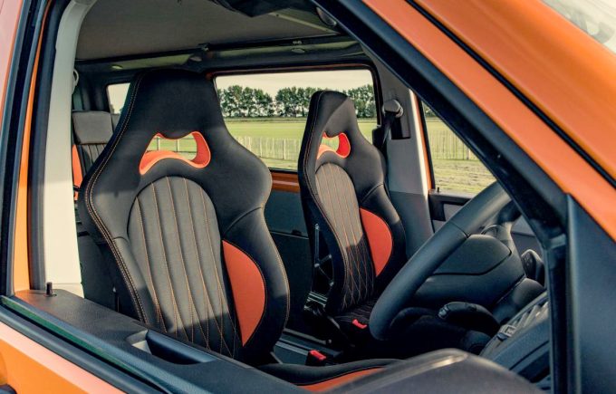 Pour un gain de place et de poids, le chauffage est assuré par un système à air pulsé alimenté par le carburant du véhicule. En cabine, les sièges d’origine cèdent leur place à deux séduisants baquets à coque carbone (plus légers et au maintien supérieur) fixés sur des embases pivotantes.