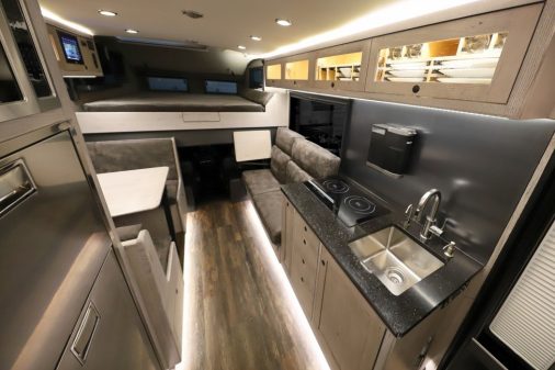 Le plan Breckenridge, le plus populaire chez EarthRoamer, comprend un coin dînette avec un espace de travail et de restauration dédié au conducteur. Le coin repas peut également se transformer en couchage. L'espace derrière le passager dispose d'une cuisine et d'une banquette identique au Boulder pour se retrouver à quatre à bord.