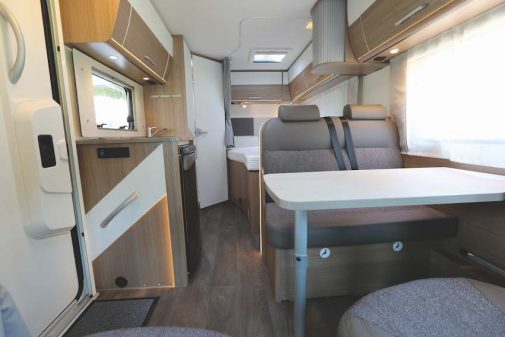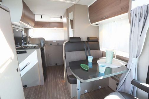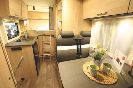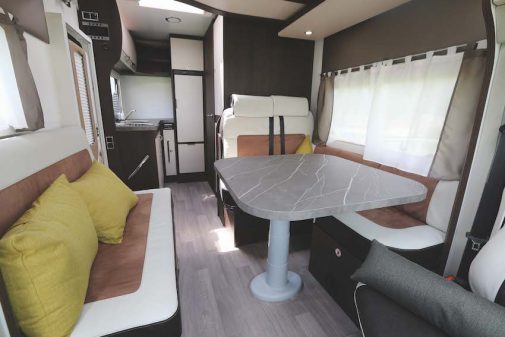 Depuis plusieurs saisons, Benimar se démarque par des implantations singulières. Le constructeur espagnol a été d’ailleurs l’un des premiers à positionner son véhicule ultra-compact Tessoro 481 comme une alternative sérieuse aux fourgons aménagés. De l’habitabilité, ce profilé en a à revendre. Pour la convivialité, ce Tessoro 481 reçoit un salon démesuré pouvant accueillir aisément 6 convives. La marque s’appuie notamment sur une longue banquette en L et un vaste sofa latéral… Sans oublier le grand plateau de table. Cette dînette est surmontée d’un lit de pavillon pour deux personnes qui fait office de couchage principal avec des dimensions généreuses de 140 x 191 cm. Sa hauteur est modulable pour conserver du tirant d’air et permettre d’exploiter le lit de dînette. En partie arrière, le traitement de la cuisine est flatteur. Le long plan de travail et le grand frigo participent à cet esprit « maison » recherché par la marque. La salle d’eau, en revanche, reste assez classique, avec toutefois une belle cabine de douche isolée des WC. Ce modèle sur Ford est commercialisé à 47 600 € avec un bon niveau d’équipement d’origine.