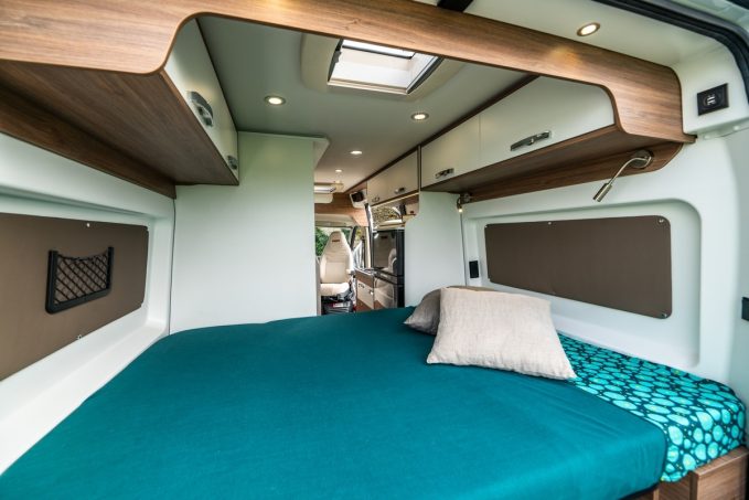 • Le lit transversal est surmonté de rangements. © Camping-car Magazine