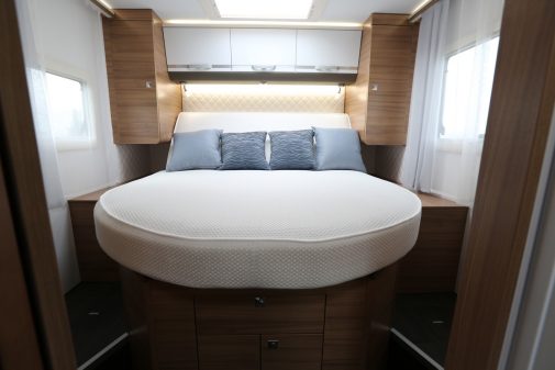 En partie arrière, ce 640 DC dispose d’un lit central de 150 x 195 cm. La tête de lit se relève et libère ainsi un large couloir de circulation en pied. Cet espace nuit s’accompagne d’une salle d’eau en deux parties qui peut, si besoin, être totalement isolée grâce au système de double cloisonnement.