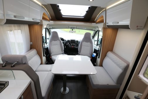 L’accès dans l’habitacle s’effectue par la porte de 60 cm de largeur. A noter que cette dernière profite de série d’une baie et d’une moustiquaire. Une fois à bord, il est difficile de ne pas souligner l’atmosphère moderne qui s’en dégage. Avec ce Matrix, Adria démontre une fois de plus qu’elle excelle sur le travail des ambiances. Il faut dire que l’apport de luminosité ambiante grâce au skyroof ouvrant de série contribue à mettre en valeur cet habitacle soigné.