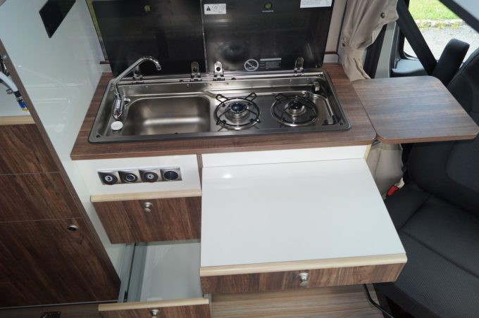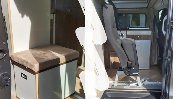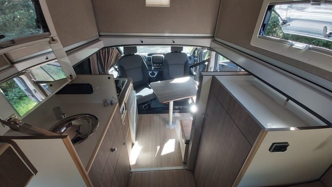 Sur ce poste justement, les ingénieurs ont choisi de loger une porte coulissante. Un système moins contraignant pour l’ouverture et qui permet, par conséquent, de gagner en habitabilité dans l’espace salon. Le coin repas a lui aussi été modifié avec la présence d’un pouf à l’entrée. L’assise pourvue d’une mousse plus dense offre un meilleur confort. Il est possible de s’adosser sans être gêné par la table amovible. Le plateau profite désormais d’un rangement dédié sous le lit. A noter que ce pouf est muni de points d’ancrage dans le plancher, et peut également venir se ranger dans le coffre arrière. L’intérêt ici est de de fixer un siège supplémentaire pour un troisième passager. Ce V7 CT est homologué pour 2 ou 3 places carte grise.