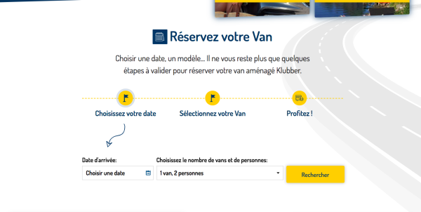 Le site klubber-trips.com propose un parcours client en ligne simple, pour louer un van Klubber en quelques clics. Ce service de location on line offre, sur une seule plateforme, un large choix de modèles de la marque de 5 à 8 places carte grise. Sur le site, vous n'avez qu'à choisir vos dates départ/retour puis sélectionner votre van.image