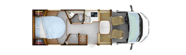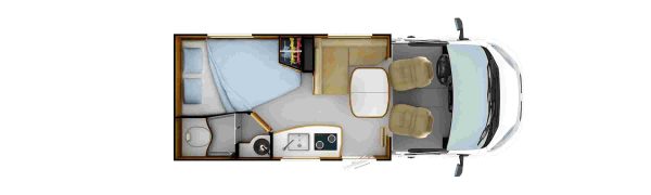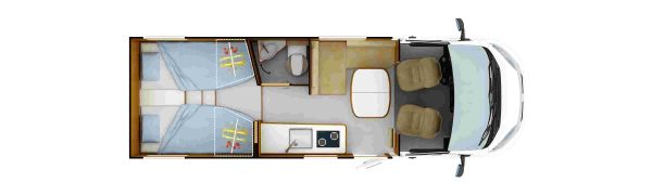 C56 : sur un gabarit intermédiaire de 6,72 m, cette nouveauté joue la carte des lits jumeaux sur soute. En revanche, la caractère exclusif est à souligner pour la partie sanitaire puisque Rapido inaugure une nouvelle salle d'eau dite Duo'Space qui consiste en une paroi mobile permettant de créer une cabine de douche isolée du cabinet de toilette.
