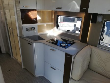 L'intérieur se veut haut de gamme avec un mobilier spécifique pour cette ligne Premium, à l'image de la cuisine qui reçoit une cuve intégrée dans le plan de travail, un réchaud combinant induction et gaz et un frigo Thetford à double ouverture. image