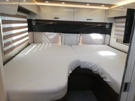 En partie arrière, la chambre accueille de grands lits jumeaux sur soute garage. La partie nuit s'accompagne d'une salle d'eau digne de celle domestique avec une vaste douche indépendante du cabinet de toilette.
