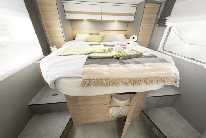 Dethleffs est cependant fière de dévoiler également le T6812 EB, un véhicule à lits jumeaux avec une soute de près de 1,20 m de hauteur. Chaque Just 90 peut recevoir un lit de pavillon électrique, une option facturée 1565 €.