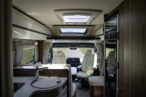 D’une largeur de 2,35 m, le profilé offre un espace propre à la série d'intégraux B-Masterline. La nouveauté de ce profilé réside dans les ouvertures possibles sur le côté afin d’optimiser l'espace de rangement intérieur. La cuisine dévoile un plan de travail spacieux.
