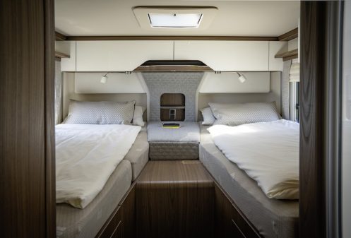 Le profilé reçoit une salle d’eau luxueuse avec une douche spacieuse d'une hauteur maximale d'1,94 m. Le séjour et le coin nuit peuvent être séparés pour plus d’intimité. Les lits jumeaux mesurent plus de 2 m de longueur sur une largeur d’environ 90 cm. Ils sont dotés de série d'un système de couchage ultra-confort. Le profilé est disponible avec un mobilier clair et des éléments blanc mat. Une ambiance plus chaude et du blanc brillant peuvent être choisis en option. image