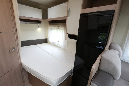 La cuisine fait également preuve d’une belle fonctionnalité avec un plan de travail recevant un réchaud 2 feux ainsi qu’un lavabo. Le frigo fait face à ce bloc, Itinéo ayant fait le choix de loger un modèle de 142 l avec sélection automatique d’énergie d’origine.
