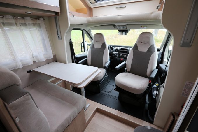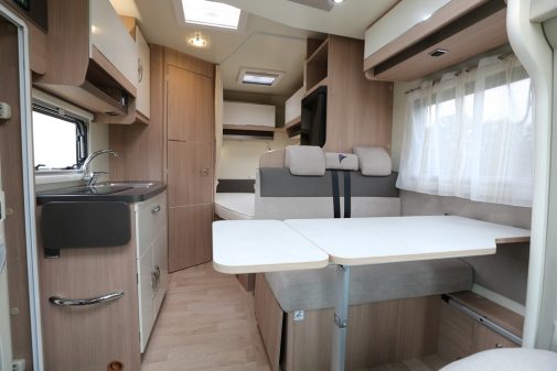 Ce couchage montre des dimensions tout à fait honorables, même s’il faut souligner le biseau en pied pour faciliter la circulation. Attenante à la chambre, la salle d’eau fait preuve d’espace et de fonctionnalité. Un poste optimisé qui comprend un WC, un lavabo ainsi d’une douche isolée par des battants. En partie avant, ce compact propose un salon pour 4 personnes avec banquette face route et les sièges pivotant du poste de conduite.