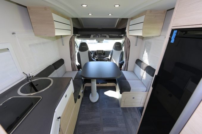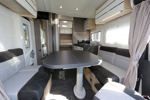 Chausson a en effet décidé d'arrêter la commercialisation de profilés de 7,50 m de longueur. Cet inédit 788 vient en remplacement de l'ancien 758 qui tire sa révérence. Il faut dire que ce dernier logeait encore une banquette en L. Désormais le 788 adopte toutes les tendances fortes du marché français, à commencer par le salon Smart Lounge. Avec ses banquettes en vis-à-vis, celui-ci offre une belle sensation d'espace, non négligeable sur un tel gabarit.