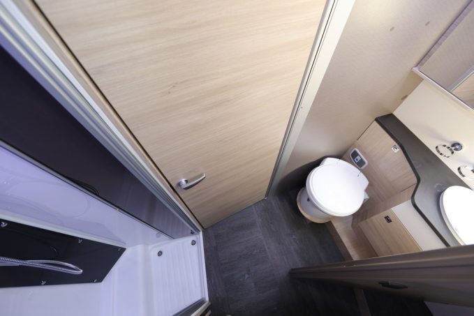 Pour le marché français, ce profilé s'accompagne en partie arrière d'un lit central réglable en hauteur. Mieux, la chambre est agrémentée d'une salle d'eau à double cloisonnement permettant à l'envi d'utiliser soit la douche, soit le cabinet de toilette, soit de réunir l'ensemble pour profiter d'un espace transversal parfaitement isolé. Dans la configuration présentée, le 788 se positionne comme l'entrée de gamme. Il est bridé au châssis Ford de 130 ch à boite mécanique. Il sera possible de disposer de cette implantation sur un niveau intermédiaire Titanium VIP sur Fiat ou le haut de gamme incarné cette fois par le Ford et baptisé logiquement Titanium Premium. A noter que le niveau 2 et 3 adopte de série la boîte auto des porteurs respectifs, un vrai plus pour le confort de conduite.