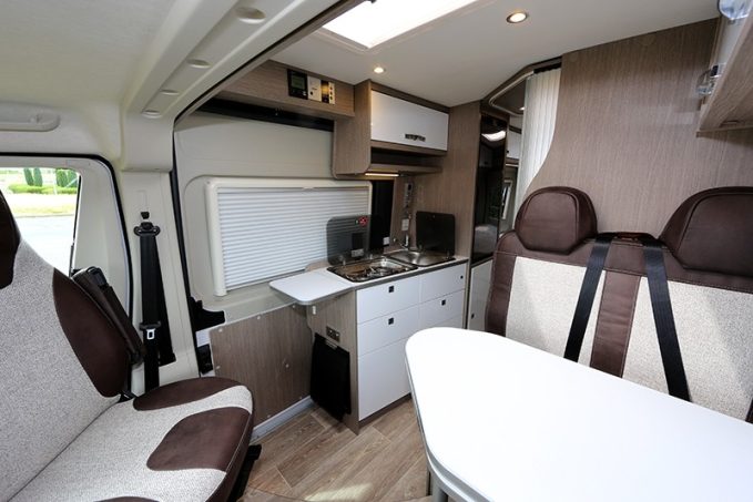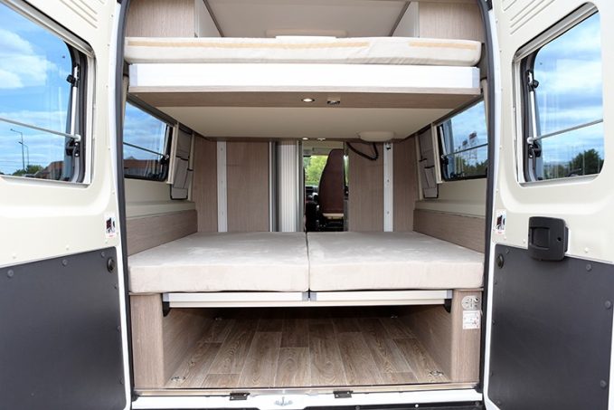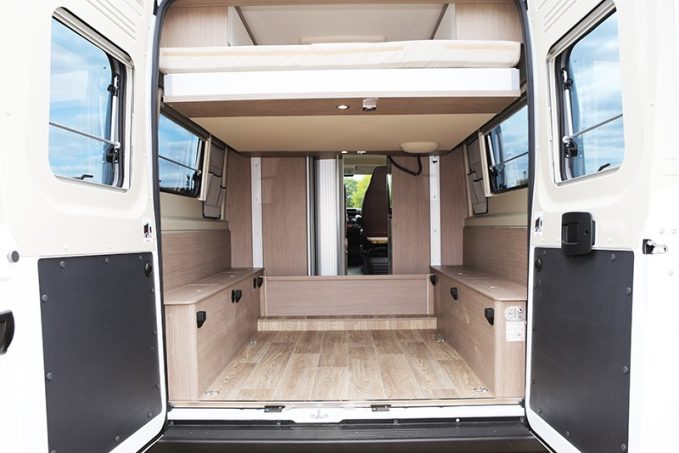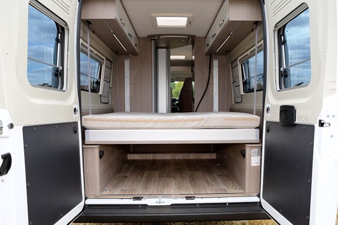 Mais pour disposer d'un véhicule moins gourmand en carburant, c'est une variante de châssis H2 n'affichant que 2,61 m de haut qui a été préférée. Pour obtenir une soute XXL (131 cm de large contre 115 cm habituellement) et conserver le système de double grand lit (en option) qui permet d'accueillir jusqu'à quatre personnes pour la nuit, l'espace disponible a été entièrement repensé. Les réserves d'eau propre et eaux grises ont été déplacées sous le châssis tandis que le compartiment destiné aux deux bonbonnes de gaz de 13 kg a été supprimé. Le réchaud n'est plus alimenté que par une bouteille de 2,8 kg, dissimulée sous le bloc-cuisine. Le chauffage, comme la production d'eau chaude, sont désormais assurés par un combiné à carburant (Truma Diesel) de série.