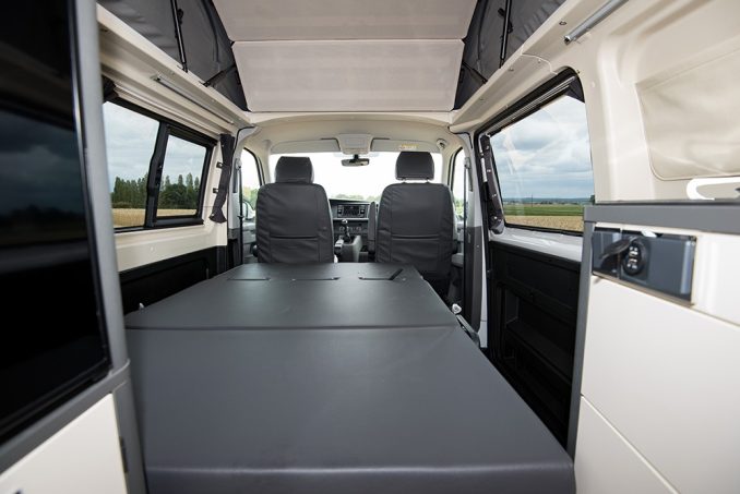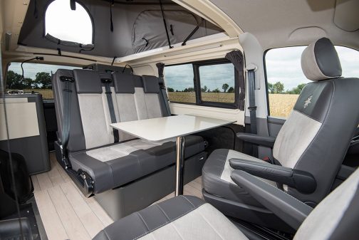 Pour sa collection 2021, Westfalia a présenté, comme principale nouveauté, le Kepler Five, un van à toit relevable affichant une longueur de seulement 4,90 m et pouvant accueillir 5 passagers. Ces derniers auront droit, en partie avant, à une ambiance très automobile puisque les sièges passagers et conducteur, ainsi que la banquette trois places, constituent le seul "mobilier" de la partie avant. Seule concession à la vocation "loisirs" dans cet espace, la largeur de l’assise arrière volontairement réduite à 110 cm afin de préserver un couloir de circulation vers l’arrière. Un choix qui n’est pas sans conséquence : si trois enfants tiendront aisément (à condition qu’ils n’aient plus besoin de rehausseur ou de siège auto), trois adultes y seront à l’étroit.