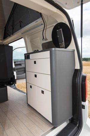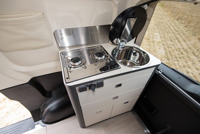 Cuisine et meuble de rangement se trouvent à l’arrière. La première, aussi bien accessible de l’intérieur que de l’extérieur, dispose d’un réchaud deux feux et d’un évier (autonomie de 64 litres d’eau propre) quant l’autre reçoit le réfrigérateur de 51 litres et un petit placard. Une table amovible permet de prendre les repas dans la dînette. Derrière la banquette, un espace permet d’accueillir, par exemple, un WC portable, mais également, en rabattant la troisième partie du couchage bas, une méridienne où se délasser. A propso du lit de dinette, celui-ci se met en place en un tournemain grâce à un système type BZ. A l’étage, le toit relevable, articulé à l'avant afin de permettre de se tenir debout en cuisine, abrite un matelas de 195 x 110 cm.