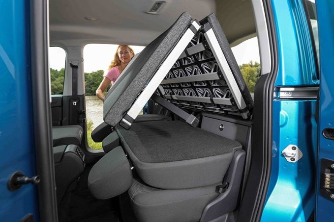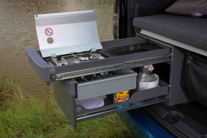 Par rapport à l'ancien Caddy Beach, la banquette arrière ne compose plus une partie du lit. Elle peut être retirée au besoin pour gagner de la place pour les bagages. Indépendant, le couchage repliable (198 x 107 cm), en trois parties, fait appel à un sommier ''tulipes'' qui améliore son confort. Le coffre est équipé d'un caisson amovible à tiroirs coulissants (sur le flanc gauche) pour conserver à portée de main des ustensiles de cuisine et disposer d'un réchaud à gaz (bonbonne de 1,8 kg) avec un plan de travail en Inox. Deux sièges et une table, repliables et rangés dans une housse dédiée, y trouvent aussi leur place pour se poser confortablement à l'étape. Deux sacoches amovibles sont également prévues, de part et d'autres des vitres arrière, pour transporter des effets personnels.