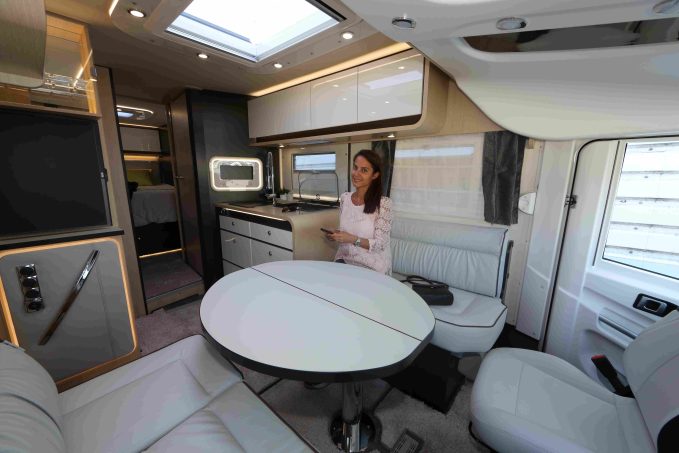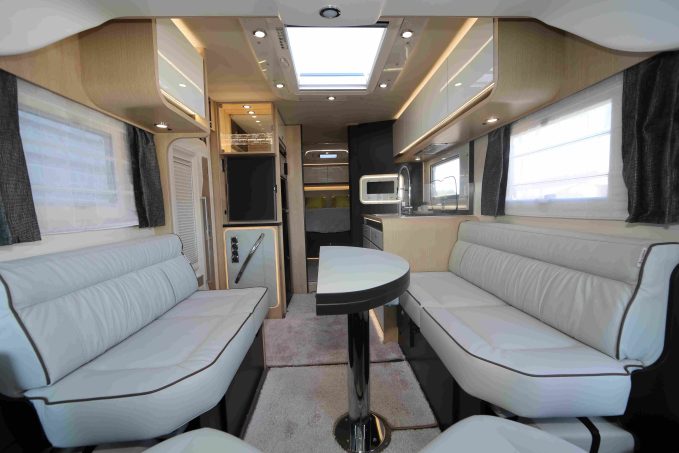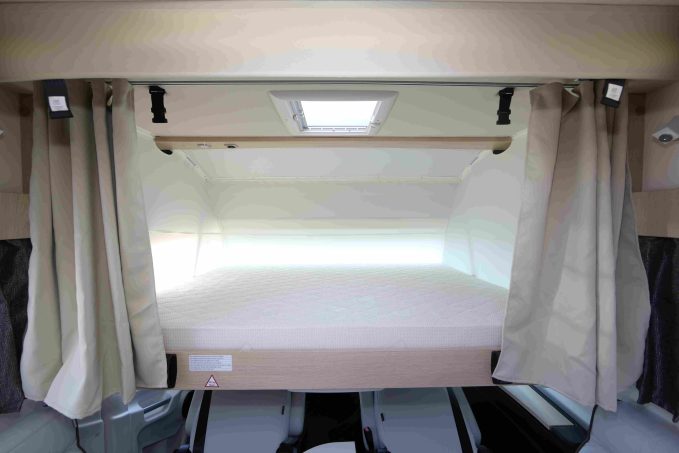 Les couchages sont au nombre de deux. Le premier occupe la position centrale en bout arrière de la cellule. Le deuxième est un classique lit de pavillon, mais de grandes dimensions, qui s’abaisse et remonte à l’aide d’un mécanisme électrique. Plus besoin de travailler son épaulé-jeté pour manier ce couchage.