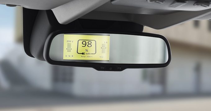 En cabine, toutes les informations utiles s’affichent sur le miroir du rétroviseur intérieur pour que le conducteur puisse visualiser en un coup d’œil le niveau de charge (en pourcentage) et le voltage de la batterie ainsi que la vitesse engagée (Drive, Neutral, Reverse). L'indicateur Go Green s'allume au démarrage pour annoncer que le véhicule est prêt à rouler.