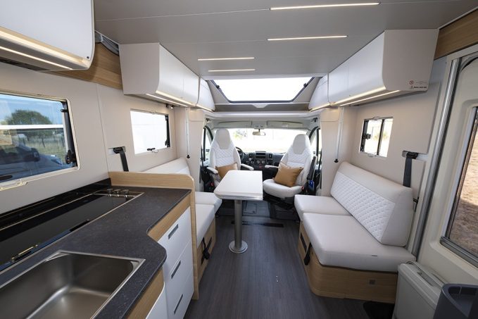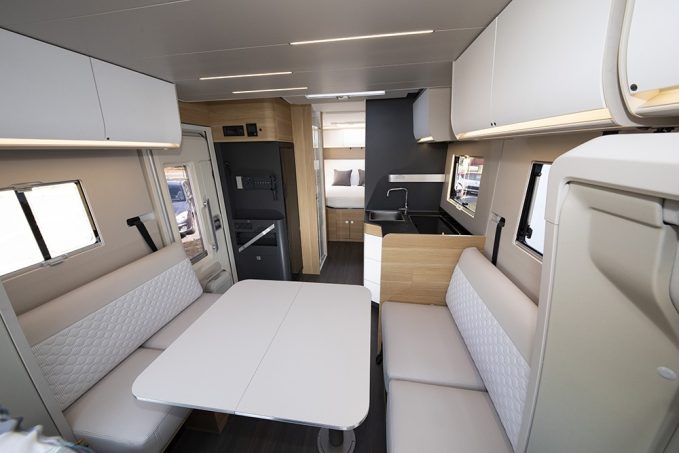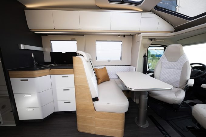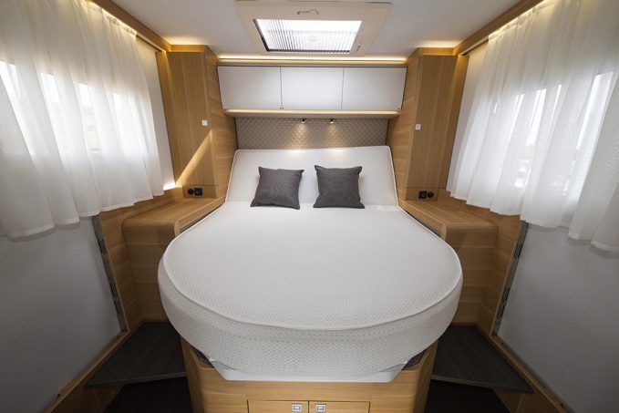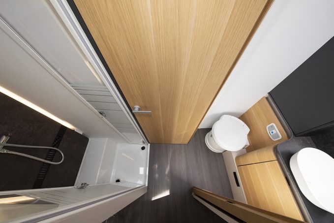 La mise au point du lit de pavillon est certainement le meilleur exemple du soin apporté tant à la réalisation qu’à la présentation de ces modèles. Son intégration parfaite au plafond, une fois replié, et l’incrustation de rails de guidage dans les jambages de cabine sont tout bonnement étonnants. De même, aucuns câbles ou fils ne sont visibles. Le nouveau système de manœuvre, plus simple (un seul moteur) et moins gourmand en espace, profite aussi bien à la charge utile qu’aux dimensions du matelas qui affiche une largeur de 130 cm pour 2 mètres de long. Et tout le mobilier, qui concerne donc les deux modèles, est à l’avenant avec de belles surfaces lisses, des système «push to open» sans poignée sur tous les placards, des matériaux choisis, le tout proposé dans des ambiances soignées (quatre au total dont deux optionnelles). Concernant la salle d’eau, nous avons affaire à des espaces traversants en deux parties, isolables des chambre et espace jour grâce à des portes de cabinet de toilette à double chambranle et d’autres, coulissantes, côté chambre.