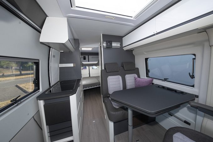 Ce nouveau modèle signé Adria sonne comme une évidence : un fourgon pour quatre offrant moult rangements. Comment faire ? Tout simplement en prenant l’implantation du 600 SPB à lits transversaux arrière superposés et en la transposant dans un véhicule 36 centimètres plus long. Nous retrouvons donc la dînette typique Adria avec banquette duo face route, table à rallonge pivotante et sièges de cabine à embase rotative. Idem pour le meuble de cuisine, à l’entrée, dont le plan de travail en biseau reste une bonne idée, tant du point de vue pratique, plus de place à l’entrée, qu’esthétique grâce au raccordement parfait avec la profondeur du réfrigérateur. Ce dernier, à compression, est inédit et peut, au choix, afficher une contenance de 84 ou 138 l. Dans le premier cas, il partagera son meuble avec un rangement. En face, la salle d’eau est la bien connue Duplex, à paroi pivotante permettant de transformer l’espace en cabinet de toilette ou grande douche en une fraction de seconde.