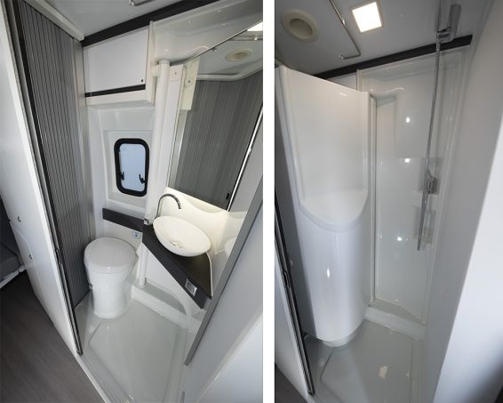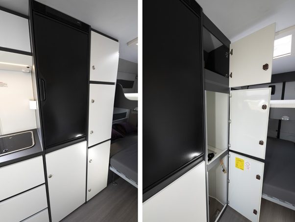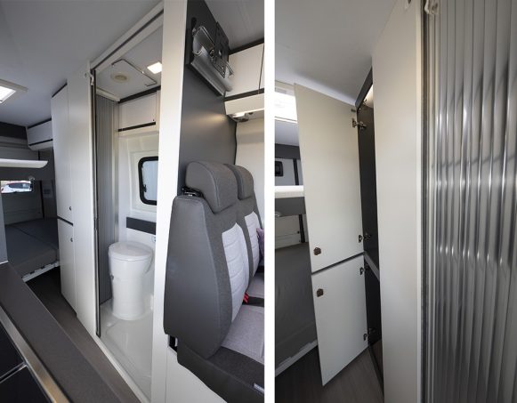 C’est entre la partie jour et l’espace nocturne que le 640 SPB se distingue puisque les centimètres en plus, par rapport au 600 du même métal, sont exclusivement consacrés aux rangements avec deux grandes penderies côté gauche et trois placards en face. Les deux plus bas servent de coffre à gaz. Une disposition perfectible puisqu’il faut se faufiler dans le couloir pour changer les bouteilles, au risque d’abîmer les parois. De même, il sera peut-être judicieux de transformer l’un des deux (logiquement le plus haut) en rangement, la présence d’un réfrigérateur à compression permettant d’économiser du gaz.