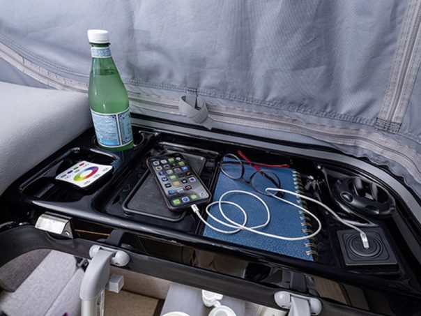 Pour développer son toit relevable, le groupe Knaus-Tabbert semble avoir imaginé cet élément non pas comme un couchage d’appoint, mais comme une véritable pièce en plus. En témoignent les équipements embarqués dans cette chambre en duplex avec des rangements compartimentés servant de tables de chevet, des prises USB, un poste de recharges à induction intégrées pour smartphones et des buses de chauffage. La mise au point de ce toit a été menée en interne. Il est, fabriqué selon la technique LFI (Long Fiber Injection), du polyuréthane renforcé par de longues fibres de verre, un composé permettant une grande rigidité, une bonne isolation naturelle et un gain de poids certain. Il est également équipé, au niveau de la trappe d’accès aménagée dans le pavillon du fourgon, d’un lanterneau ouvrant apportant une belle luminosité en dînette.