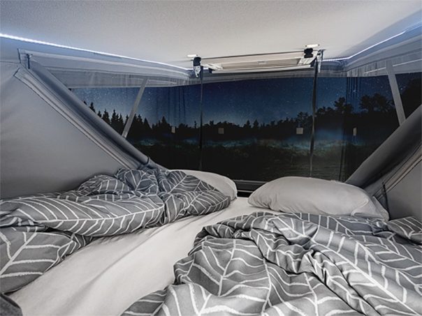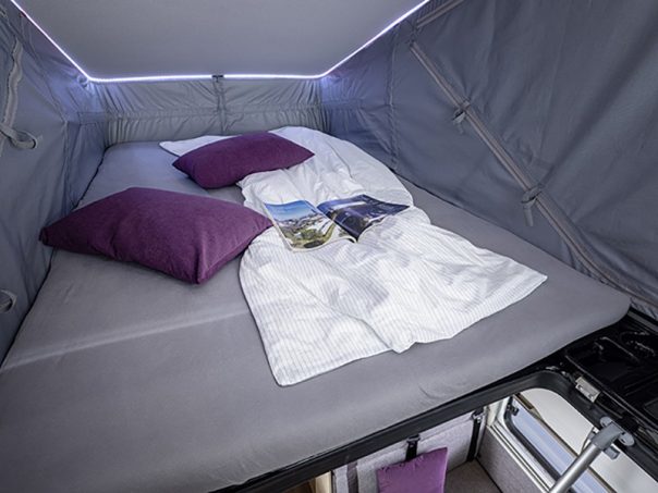 Au-dessus du pare-brise, une casquette permet une belle intégration du toit ainsi qu’une meilleure aérodynamique. Le lit affiche de belles dimensions puisque sa largeur atteint 135 cm pour une longueur de 2 mètres. Autre atout de cette chambre, sa fonction Cabrio qui permet d’ouvrir la toile sur une très grande partie, offrant ainsi une vue quasi panoramique, un bandeau de leds réglables tant en luminosité qu’en couleurs se chargeant de l’ambiance. Une moustiquaire permet de dormir pour ainsi dire à la belle étoile, sans craindre moustiques et autres indésirables.