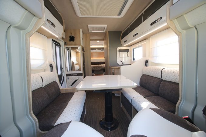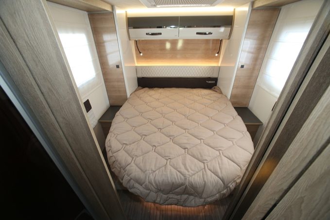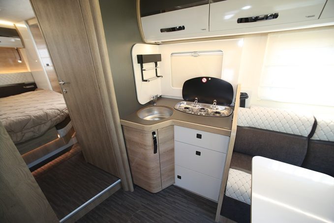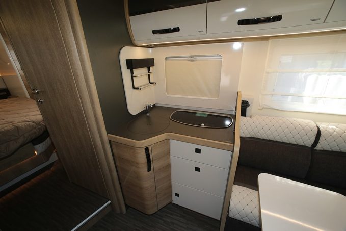 Les nouveaux Kea affichent une belle ambiance, chaleureuse et cosy. Dans le P 90, nous avons droit à un magnifique salon face-à-face dont les sofas offrent un très bon confort. Au centre, la table sur pied excentré offre une double cinématique de manœuvre : repliable en son milieu et rotative. La cuisine en L inversé offre un réchaud trois feux ainsi que, à l’opposé, un réfrigérateur de 150 l. Dans la chambre, le couchage central affiche de belles dimensions : 150 x 195 cm. Le pied des matelas et sommier est biseauté pour faciliter le passage de part et d’autre. La salle d’eau, disposée à l’entrée de la chambre, est en deux parties : douche à droite, cabinet de toilette et bloc WC à gauche, chaque espace étant indépendant. Ils peuvent être joints grâce à des portes, battante vers l’avant et coulissante à l’arrière, et complétement isolés du reste de l’habitation. La dînette se transforme en un lit de 98,5/83,5 x 212 cm. Enfin, il est possible de prendre en option (1 000 €) un lit de pavillon pour deux (128 x 190 cm), portant ainsi la capacité de couchage à cinq. Concernant l’équipement, ce dernier se montre convaincant avec la climatisation, le régulateur de vitesse, l’autoradio, les stores d’occultation, le skyroof, l’isolation du réservoir des eaux usées. Même exigence au niveau esthétique avec jantes alliage, peinture intégrale ou encore les calandre et phares noirs. Notons également la porte de cellule extra large ou les bas de caisse cachant des rangements. Le tarif reste cantonné sous les 64 000 €. Raisonnable.