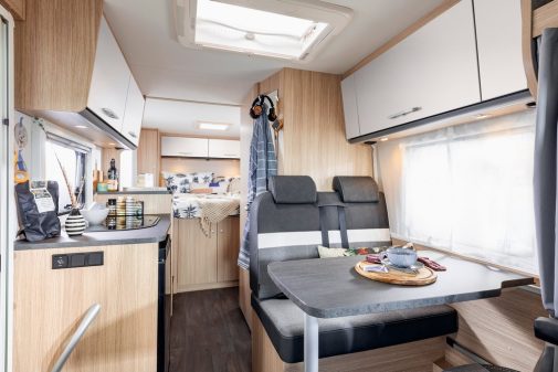 En qualité de marque généraliste, Sunlight revendique une belle richesse de produits à travers ses gammes de capucines, intégraux, fourgons et bien évidemment profilés. Pour 2021, la nouveauté provient notamment du V69, un véhicule compact à la fois en longueur (6,86 m) et à la largeur contenue (2,15 m). Pour autant, l’habitabilité à bord est remarquable et le confort nocturne est confié à un lit central. Sur ce point, Sunlight a parfaitement maitrisé son agencement intérieur. Notamment le passage autour du lit qui le place parmi les excellents élèves sur le marché, et ce malgré la compacité.