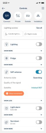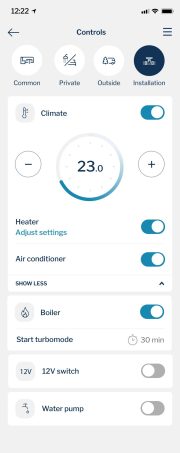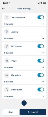 L'application embarque diverses programmations répondant à différents scénarios établis par défaut ou personnalisables. Vous aurez accès au mode "Bonjour" qui lance la chauffage selon une température définie, met en marche le chauffe-eau en prévision de la douche et allume les lumières selon l'intensité choisie. A contrario la fonction "Bonne nuit" s'occupe d'éteindre l'ensemble des équipements, de réguler la température et de rabattre l'antenne satellite par exemple. Il existe également des programmes lorsque vous quittez votre domicile ou lorsque vous arrivez pour la première fois sur une aire ou dans un camping. Ceux-ci peuvent être adaptés aux besoins individuels avec une personnalisation possible.