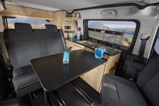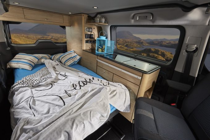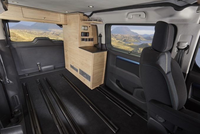L'aménagement ''camping-car'' comprend différents rangements comme une penderie et un placard, à l'arrière, une kitchenette avec réchaud gaz (deux feux) et un évier (réserve d'eau de 10 l) sur le flan gauche sur laquelle peut être accrochée une table. Cet ensemble est protégé par des couvercles en verre. La douchette extérieure, connectée à une réserve d'eau froide de 25 l, est elle accessible par le coffre. Les sièges cabine sont fixés de série sur des platines pivotantes pour pouvoir les retourner vers le salon.