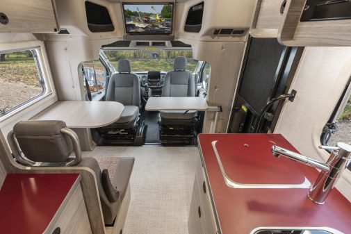Dans ces deux modèles, le salon ne peut accueillir que quatre personnes, une fois les assises cabine retournées, mais dispose de deux tables repliables. Côté passager, la traditionnelle banquette droite ou en L cède sa place à deux sièges individuels... plus appropriés aux voyages au long cours.
