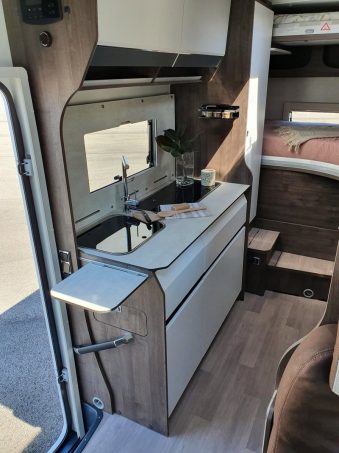Pour 2021, l’offre se répartit ainsi : 3 profilés, 1 capucine et 4 fourgons. Sur cette dernière carrosserie, il faut souligner l’arrivée du Benivan 190 Up (47 100 €) qui inaugure un plan inédit : sur un gabarit de 6,36 m, cette nouveauté se distingue par son lit de pavillon dans la chambre. Benimar crée ainsi une grande soute au volume variable et capable d’accueillir des vélos voire un scooter ou une moto. Que les amateurs de compacité se rassurent, la marque leur propose le 105, d’une longueur de 5,41 m. Si l’agencement reprend le plan du 104 présenté l’an dernier, on y voit logé un toit relevable de série. Ce petit véhicule peut donc prétendre recevoir 4 personnes sur route comme à l’étape par le biais des deux lits doubles quasi-permanents.