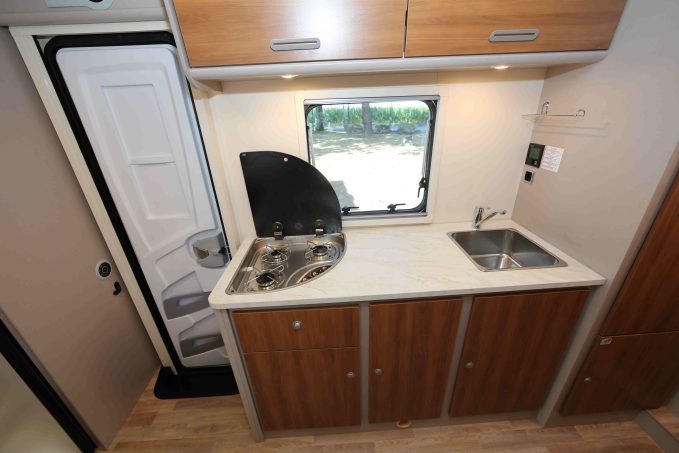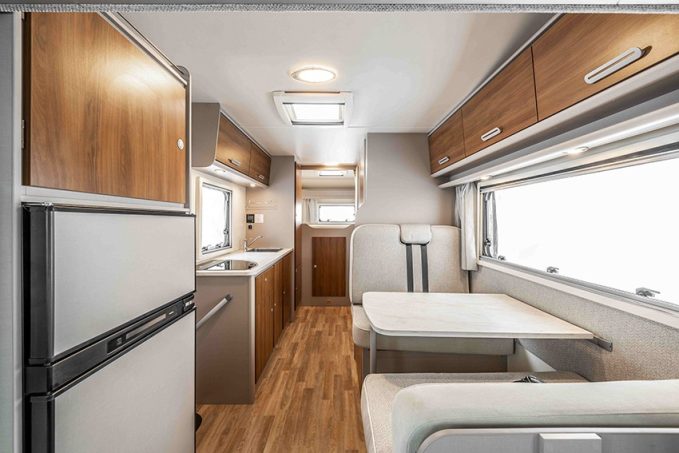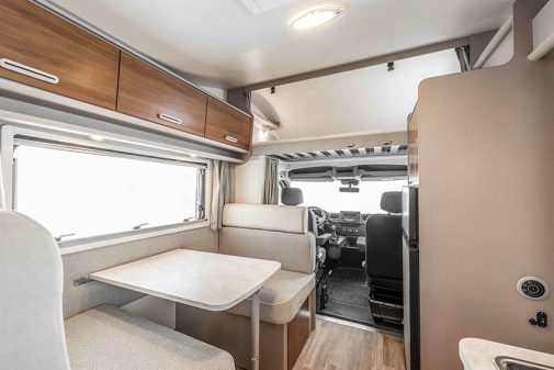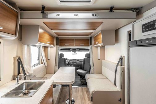 Avant tout destinée aux familles (homologuée en 6 places cartes grise), la capucine Rimor Hygge 5 embarque deux couchages transversaux. Ils sont situés au-dessus de la cabine (220 x 145 cm) et en partie arrière (220 x 134 cm). Le salon fait appel à deux banquettes qui se font face (transformables en lit de 188 x 124 cm). Les sièges cabine ne se retournant pas, l'assise de la dînette se rallonge pour y prendre les repas à six.