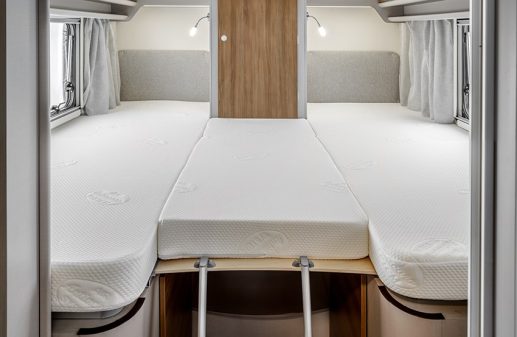 Le Hygge 95 Plus, accueillant aussi un grand lit avant en pavillon (200 x 123 cm), adopte par contre à son extrémité arrière des lits jumeaux (200/205 x 80 cm). Ils peuvent être utilisés séparément ou bien raccordés par une mousse d'appoint pour un confort XXL. Son coin dînette dispose d’une traditionnelle banquette en L associée à un coussin d'appoint pour s'y retrouver jusqu'à six convives.