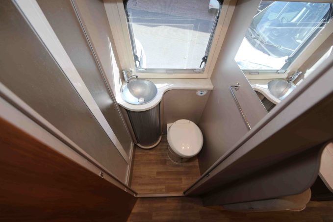 Les profilés Hygge 12 P (sans lit de pavillon) et Hygge 12 P Plus (avec lit de pavillon électrique de 188 x 124 cm) se démarquent de leur côté par leur couchage à la française (205 x 138 cm). Celui-ci est situé à l'arrière gauche de la cellule (dans le sens de la marche) pour dégager un espace convenable à la salle d'eau attenante (à droite). Leur salon comporte deux belles banquettes transversales.