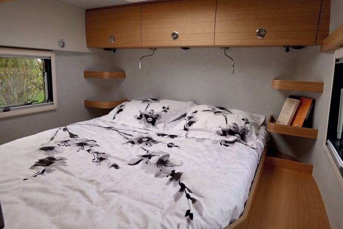 L’implantation est réalisée avec soin et selon les désirs et goûts de chacun. Il aura fallu trois mois pour venir à bout de ce modèle après être passé entre les mains des ouvriers qualifiés de l’aménageur. Sur ce modèle, l'implantation reprend un salon face/face et plutôt original, un lit central avec lavabo en pied de lit. Un agencement plus trop courant dans l'univers "classique" du camping-car mais rien n'est impossible pour Brisebras. Le mobilier en placage bois naturel vernis, apporte chaleur et naturel au sein de ce X-Rok. Les larges gammes de stratifiés utilisés permettent quant à elles de varier les décors et peuvent même être personnalisés.