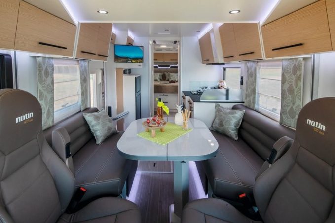 Peuvent aussi s’ajouter à la facture les packs Calgary (à 13 450 €) ou Volga (de 16 400 € à 19 480 €) qui ajoutent la boîte auto 9 rapports, un climatiseur de toit, des suspensions pneumatiques, un système de vision à 360°, une pile à combustible, un lave-linge. Affiché à près de 270 000 €, le Notinliner 940G reçoit un grand garage pour une voiture Aixam quatre places. Le porteur Iveco Daily de PTAC de 7 490 kg est animé par le moteur 205 ch. Ce géant de 9,40 m de long et 3,45 m de haut est désormais disponible en blanc et gris (en plus de la teinte champagne). Comme l’ensemble des Notin, le Liner peut bénéficier de l’ambiance intérieure Scandinave (Chêne claire et blanc, poignées noires) qui complète la décoration Java. Le bureau d’études a aussi œuvré sur un projet qui sera révélé cet automne