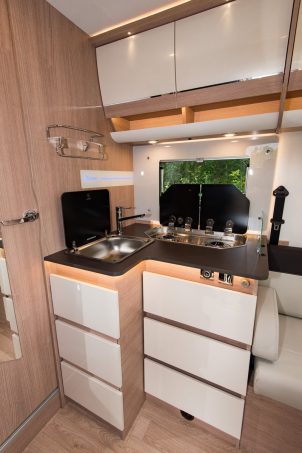 Spécialiste de l’intégral, Itinéo propose pour la troisième saison consécutive une série de profilés. Le PM 740 (lit central/7,40 m) reste le leader de cette gamme. Le PJ 740 avec lits jumeaux tire sa révérence au profit d’un véhicule plus compact (6,99 m), le PJ 700 sur Fiat Ducato. A son bord, le plan reste assez classique avec des couchages indépendants, une banquette face route agrémentée d’un sofa. La salle d’eau bénéficie, dans un espace unique, de la cabine de douche, du bloc WC et du lavabo. Cette nouveauté est commercialisée à 45 950 €. Dans la famille des profilés, on retiendra surtout le benjamin de la série, le PF 600. Ce véhicule de 5,99 m sur Fiat Ducato s’attaque au secteur du compact, venant se positionner en concurrent sérieux dans l’univers du fourgon. L’habitacle mise sur un aménagement de plus en plus vogue : le lit à la française. Si le plan semble maîtrisé, le prix l’est également à savoir 44 950 € avec la motorisation de base de 140 ch.