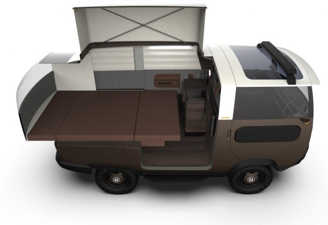 Pour économiser un maximum d'énergie, cela commence par un poids réduit à l'extrême -ne dépassant pas les 600 kg- afin de rester dans la catégorie des quadricycles lourds, malgré la présence d'un toit relevable et d'un slide-out arrière, pour la version loisirs.