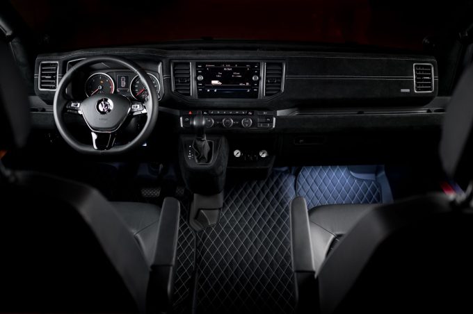 La partie cabine n'est pas en reste et n'a plus grand chose à envier à une berline de luxe du groupe Volkswagen, comme la Phaeton. Planche de bord, tapis de sol, sièges et même banquette passager s'habillent d'un superbe cuir noir que l'on a peine à imaginer souillé par de la terre lors d'escapades off-road.