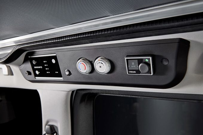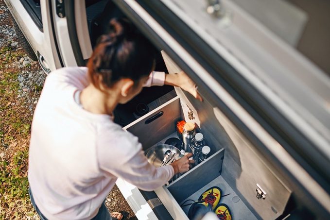 Certaines commodités restent encore disponibles, mais sous une autre forme grâce à une malle placée dans le coffre. Celle-ci dissimule un petit réchaud (alimenté par une bonbonne de gaz de 1,8 kg) et divers rangements à tiroirs pour les ustensiles. Un caisson amovible, fixé côté porte coulissante gauche, peut être replacé à l'arrière ou complètement retiré du véhicule selon les besoins. Une glacière électrique de 13 litres peut trouver sa place entre les deux sièges avant. La banquette centrale, associée à une banquette arrière biplace supplémentaire, permet, une fois les dossiers abaissés, de bénéficier d'un second couchage (140 x 199 cm). Pour un maximum de confort, un chauffage stationnaire à carburant (Webasto) est également proposé. De quoi s'évader à quatre personnes, en toutes saisons.