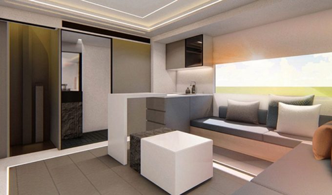 L'alcôve au-dessus de la cabine sert aussi à coucher deux personnes. Le cabinet de toilette est disposé en partie arrière. Il est attenant à une cabine d'ascenseur qui permet, à une seule personne à la fois, d'accéder à l'étage supérieur.